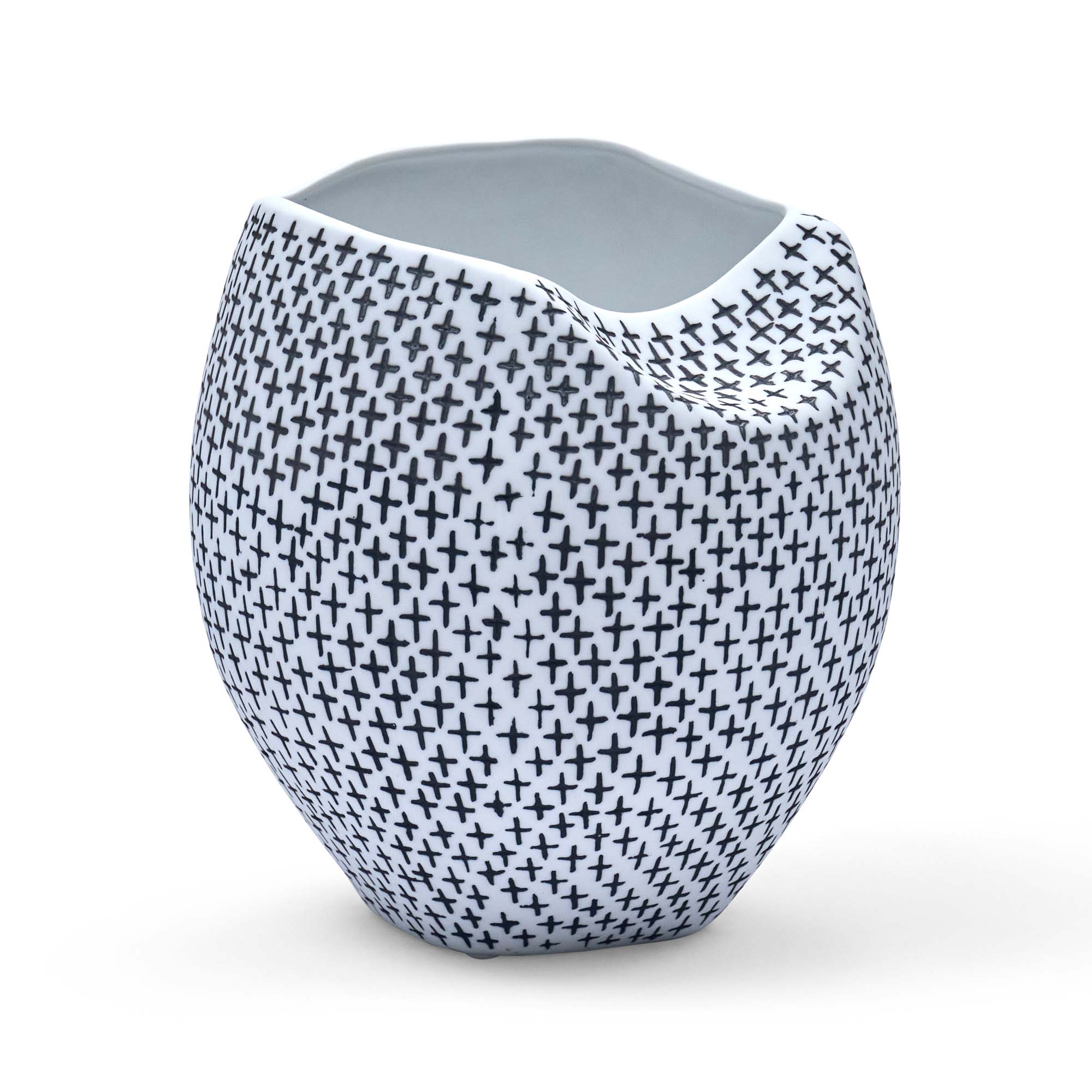 The Hana Vase Small is a stunning, sculptural piece that marries functionality with artistry. Its white organic shape is adorned with a handmade pattern of black crosses and a white interior makes it a unique & captivating addition to any space. Crafted from 100% Kaolin Ceramic using artisanal techniques, each handcrafted vase exhibits natural variations in colour, size, and finish, ensuring each Hana Vase is one-of-a-kind. While the interior features a waterproof lining, the handcrafted nature and terracotta-like characteristics mean that complete waterproofing cannot be guaranteed. We recommend thoroughly testing and monitoring its use with water to ensure optimal performance.