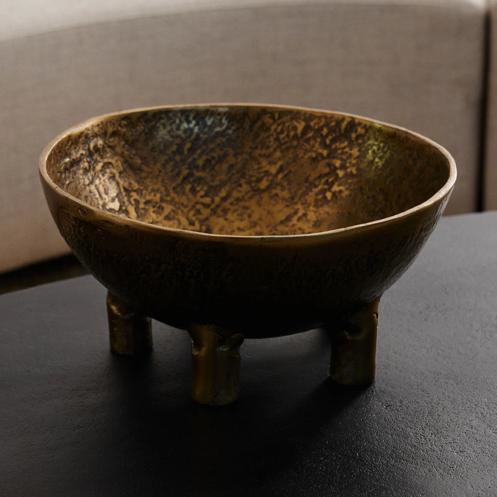 The Mondo Bowl Large. Formed from raw aluminium with an aged textural gold finish. Designed to be both eye-catching & functional. Crafted from quality materials, this large bowl rests sturdily on 4 legs & is useful as a serving or centrepiece bowl. Will add visual interest as a decorative item.