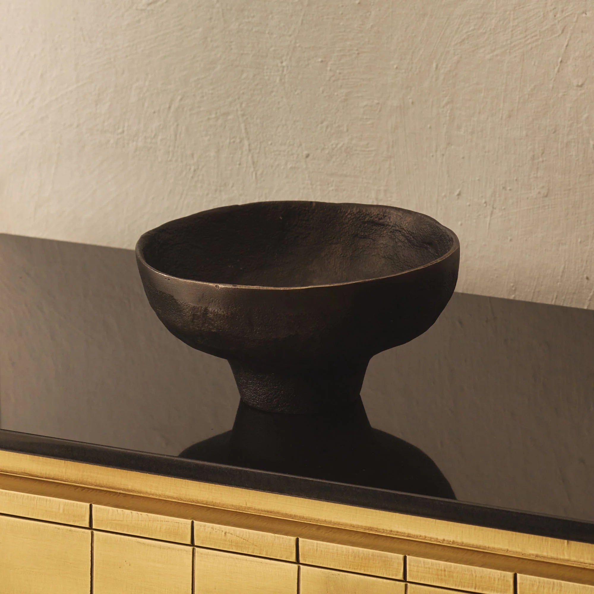 With organic simplicity and timeless appeal, the Otis hand-tooled aluminium bowl with small pedestal base features a textured antique black finish that makes a strong style statement. The natural variations in tooling and finish ensure that each piece is uniquely crafted. Perfect as a decorative catch-all, this presentation bowl effortlessly combines functionality with striking design, making it an elegant addition to any space.