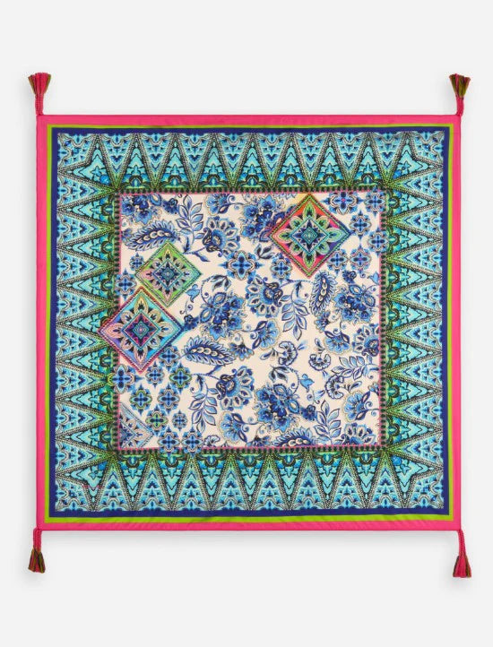 Crafted from luxurious 100% silk, the Elaine Silk Scarf is adorned with a rich pattern accented with vibrant color. Thoughtfully designed to enhance any look, this square scarf is finished with tassels at each corner for added texture. Tie at the neck or at the handle of your favorite handbag for a pop of color.
