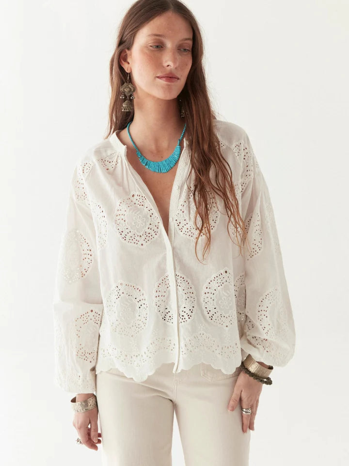 Crafted in lightweight cotton, the Margaret Blouse is a dreamy take on classic femininity. The soft ecru fabric is delicately adorned with intricate eyelet embroidery, forming circular patterns that lend a touch of vintage romance. Billowy sleeves add a sense of effortless movement, while a gently scalloped hem enhances its airy charm.