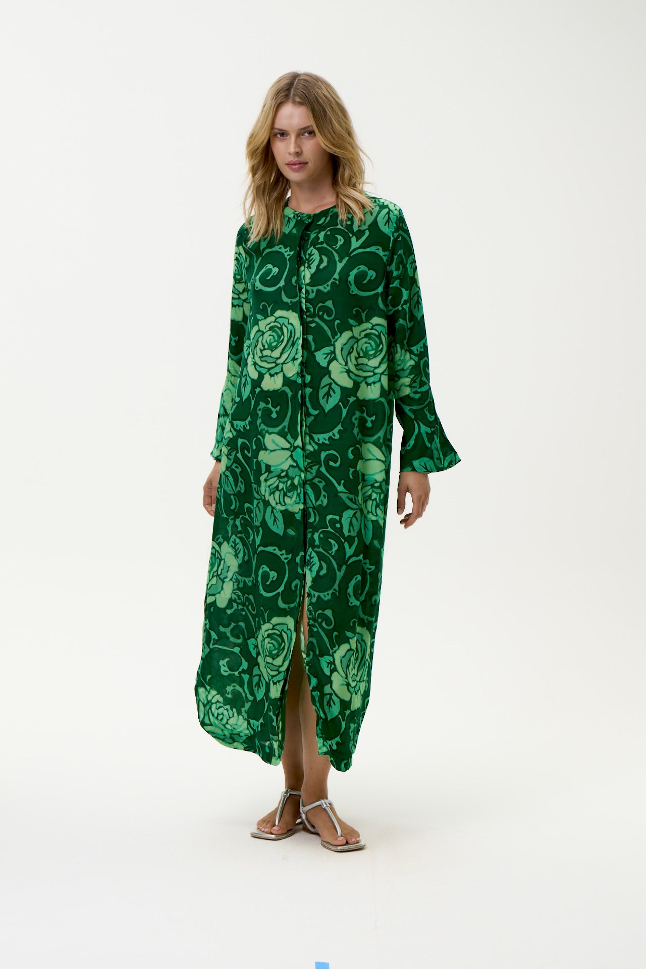 The India is the perfect wardrobe pick for stylish beach walks. Its floaty silhouette is cut from breathable viscose and arrives in a lightweight maxi- design. A charming round neckline leading to its button through placket is complemented by fluted cuffs.